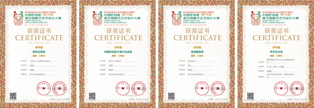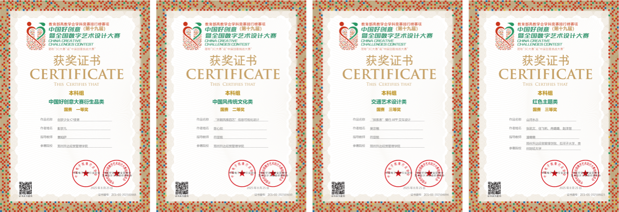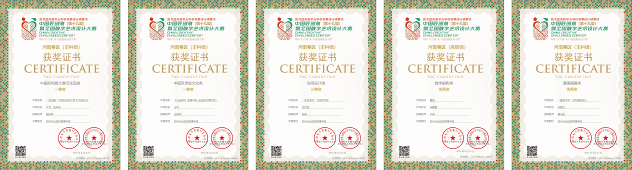 近日,教育部认证的全国数字艺术设计领域权威赛事——第十九届"中国好创意暨全国数字艺术设计大赛"(简称3C大赛)获奖名单正式揭晓。我校艺术学院设计专业师生团队凭借卓越的创意实力与专业水平,在本次大赛中共斩获国家级奖项8项、省级奖项5项,其中包括国家一等奖1项、国家二等奖1项、国家三等奖6项,以及河南省一等奖2项、三等奖1项、优秀奖2项,指导教师赛姆萨、符亚铭荣获国赛优秀指导教师,蔡怡航、潘萌萌、马倩倩荣获省赛优秀指导教师,获奖质量创历年新高。