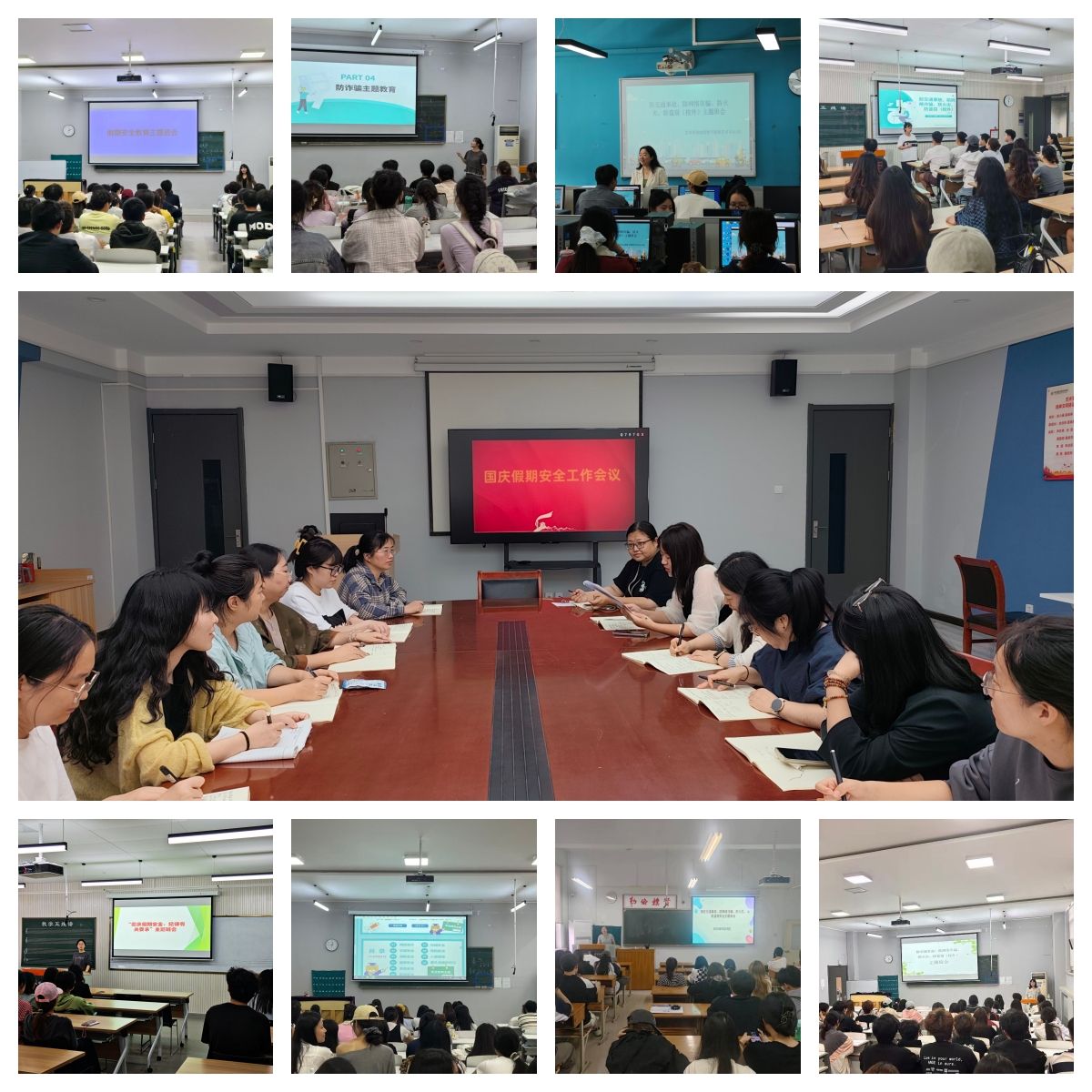 国庆假期将至,为切实增强学生安全意识,保障学生人身财产安全,为筑牢国庆假期安全防线,确保各项工作落实到位,艺术学院于节前组织召开了国庆假期安全专题工作会议,全面部署假期安全稳定工作。会后,全院各班级积极响应,迅速召开了以“防交通事故、防网络诈骗、防火灾、防盗窃(校外)”为核心内容的安全主题班会。