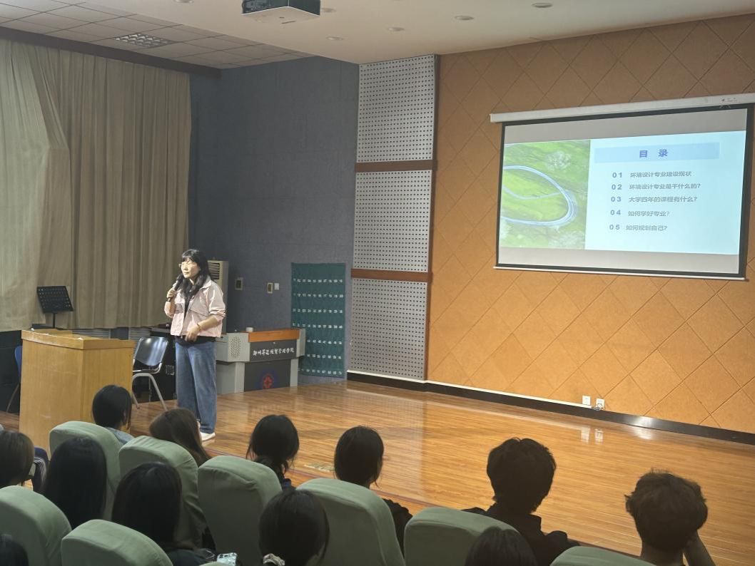 随后,崔营营老师围绕多个核心议题展开了系统而详尽的介绍。首先,在“专业认知”层面,崔老师向新生们阐述了环境设计专业的建设现状,增强了新生对专业的认同感与归属感。紧接着,通过生动的案例与形象的比喻,深入浅出地解析了“环境设计专业是干什么的”这一问题,明确了其作为集艺术、技术、科学于一体,致力于创造理想人居环境的交叉学科属性。其次,在“学业规划”层面,崔老师系统梳理了大学四年的课程体系,从基础理论、专业技能到项目实践、创新研究,勾勒出清晰的知识架构与能力进阶路径。针对新生普遍关心的“如何学好专业”以及“如何规划自己”等问题,崔老师结合多年教学经验,提出了宝贵建议:打好扎实的基本功,培养空间思维与审美能力;鼓励广泛涉猎,跨学科学习,拓宽知识视野;注重理论联系实际,积极参与工作坊、竞赛与实习实践;同时,要学会时间管理,制定短期与长期目标,实现自我驱动式成长。最后,在“未来发展”层面,崔老师着重介绍了环境设计专业广阔的职业前景与多元的就业方向,涵盖了室内设计师、设计助理、景观设计师、工程监理、销售专员、家具设计师、软件培训师等多个岗位,从而激发了新生对未来职业发展的无限憧憬。崔老师还从“学习具体执行要求”和“应该如何学习”等实操角度,对课堂纪律、作业规范、软件学习、书籍阅读、调研方法等提出了明确要求与细致指导。她强调要调整状态、整装待发,重新启航;学会利用图书馆资源,遨游知识海洋;学会科学的学习方法;正确认识自我;制定目标,做好学习和职业规划等。以期使新生尽快转变角色,适应大学学习节奏,掌握科学的学习方法。