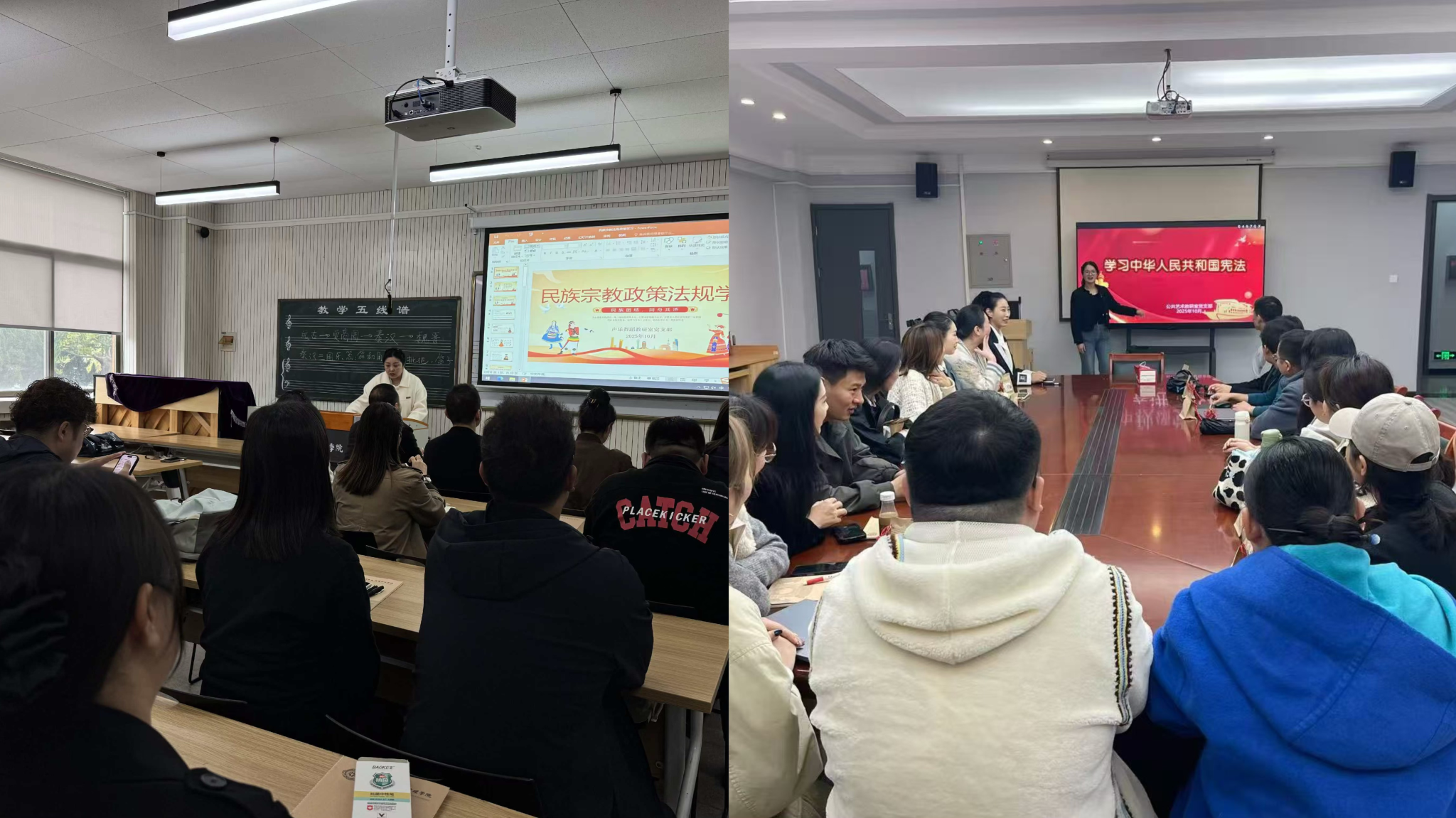 在此基础上,学院聚焦不同群体需求,推动学习活动全覆盖、精准化。9月20日,学院组织全体辅导员开展宗教理论和政策法规专题培训,重点学习《中央民族工作会议精神学习辅导读本》等重要文件,通过案例分析与政策解读,提升辅导员对学生宗教事务管理的政策把握能力与实践指导水平。10月上旬,各教研室结合专业特色,以“宗教政策与艺术教育融合”为主题开展集中研讨,教师们围绕如何在艺术教学中融入民族团结教育元素、如何通过专业实践传承中华优秀传统文化等议题深入交流,推动理论学习与教学实践有机结合。