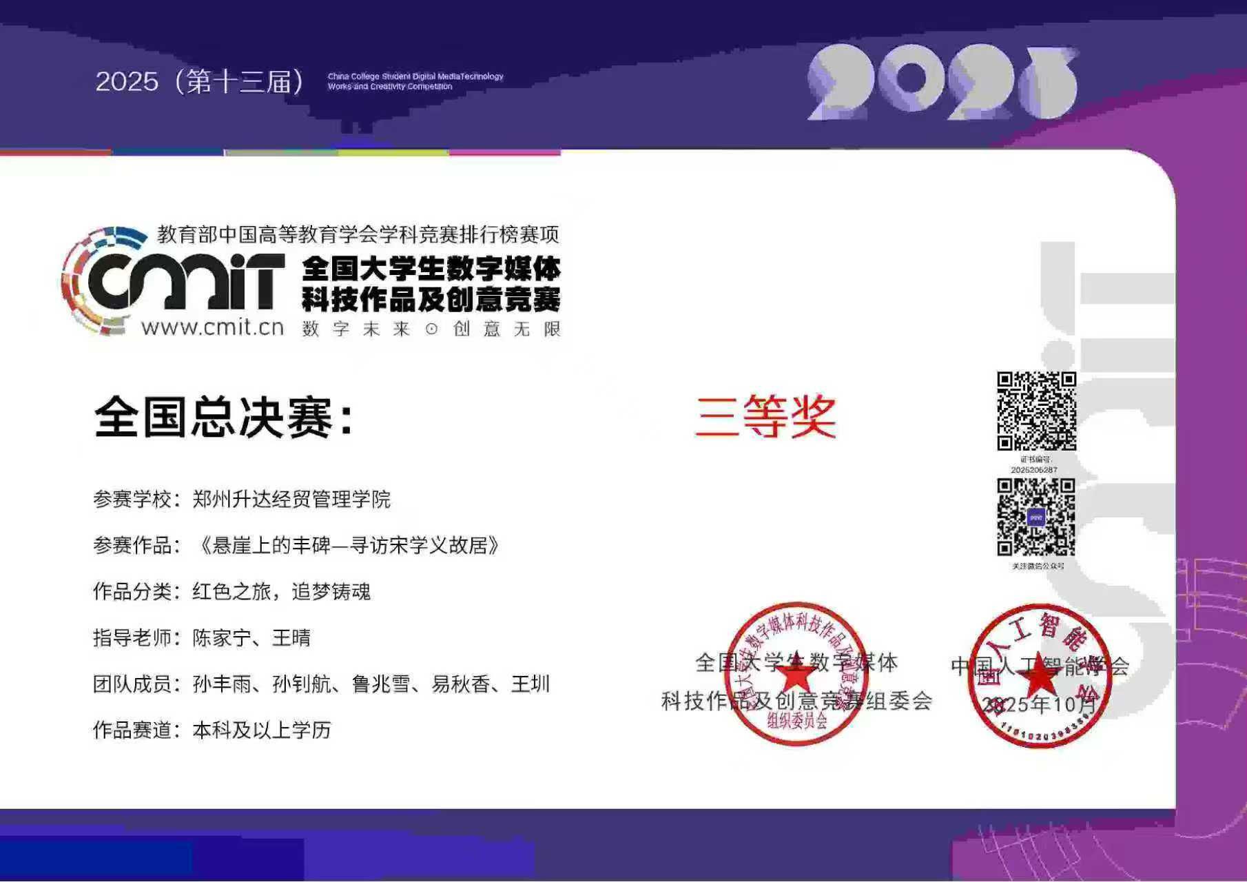 近日,2025 年第十三届全国大学生数字媒体科技作品及创意竞赛赛区赛评审工作落幕。由我校艺术学院传媒社团报送的作品《悬崖上的丰碑——寻访宋学义故居》荣获河南赛区二等奖。