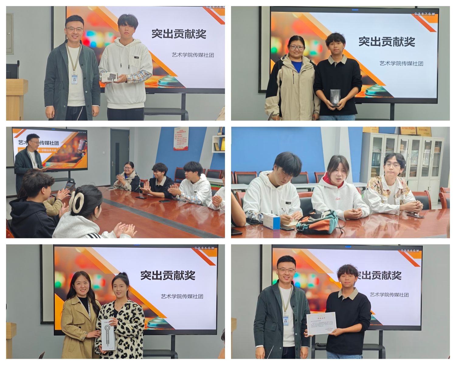在会议尾声举行的颁奖环节中,艺术学院党委副书记、团委书记尹红艳老师,以及王晴、陈家宁老师共同为表现优异的王圳、鲁兆雨、孙丰雨三位同学颁发荣誉奖品,表彰他们在内容创作、活动执行与团队协作等方面的出色表现。