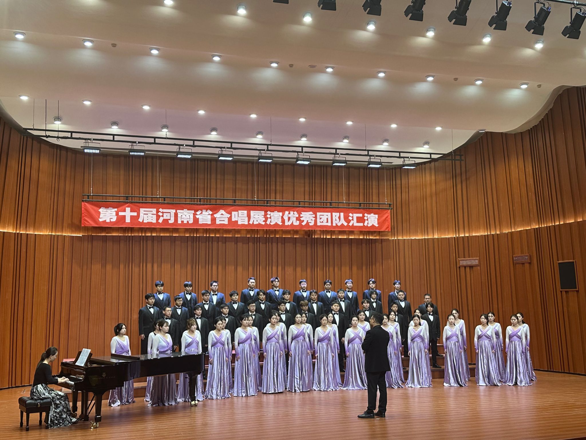 本次展演是河南省合唱领域的重要赛事,旨在推动合唱艺术发展、传承红色音乐文化。不仅是学院教学成果的展示,更是以美育人培养学生们的家国情怀和爱国主义精神的体现。星光合唱团学生们以饱满的热情和精湛的技艺,将抗日救亡歌曲中蕴含的民族精神与情感张力展现得淋漓尽致。在纪念中国人民抗日战争暨世界反法西斯战争胜利80周年的背景下,他们的演唱不仅是艺术的呈现,更是对历史的铭记与致敬!