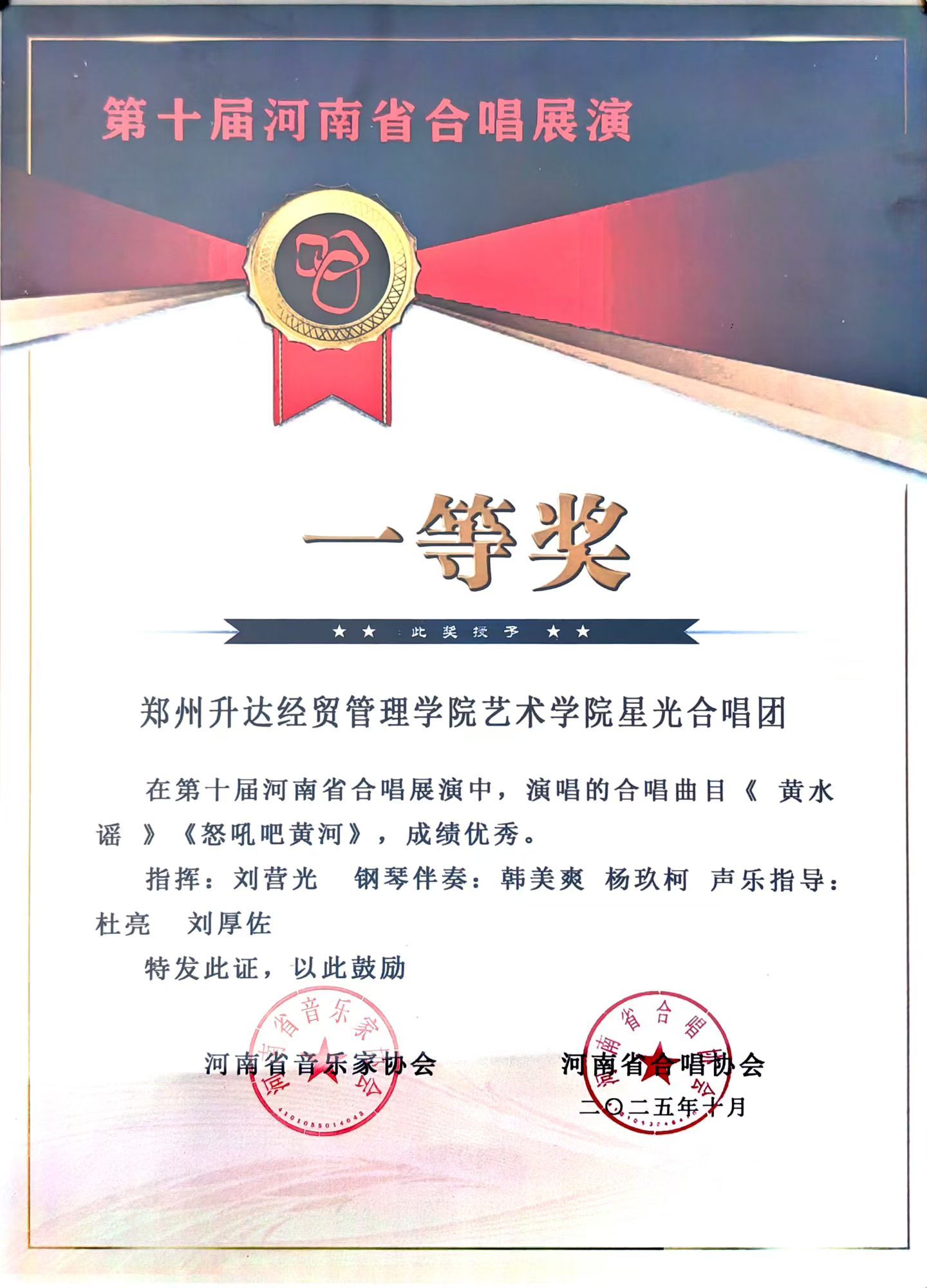 2025年10月25日,在第十届由河南省音乐家协会,河南省合唱协会举办的展演活动中,郑州升达经贸管理学院艺术学院星光合唱团凭借《黄水谣》《怒吼吧黄河》两首经典曲目,在全省117支队伍中脱颖而出,以出色的表现斩获展演一等奖。河南省合唱展演由河南省合唱协会主办,河南艺术职业学院承办,是河南省内规模最大、水平最高的合唱艺术盛会之一。