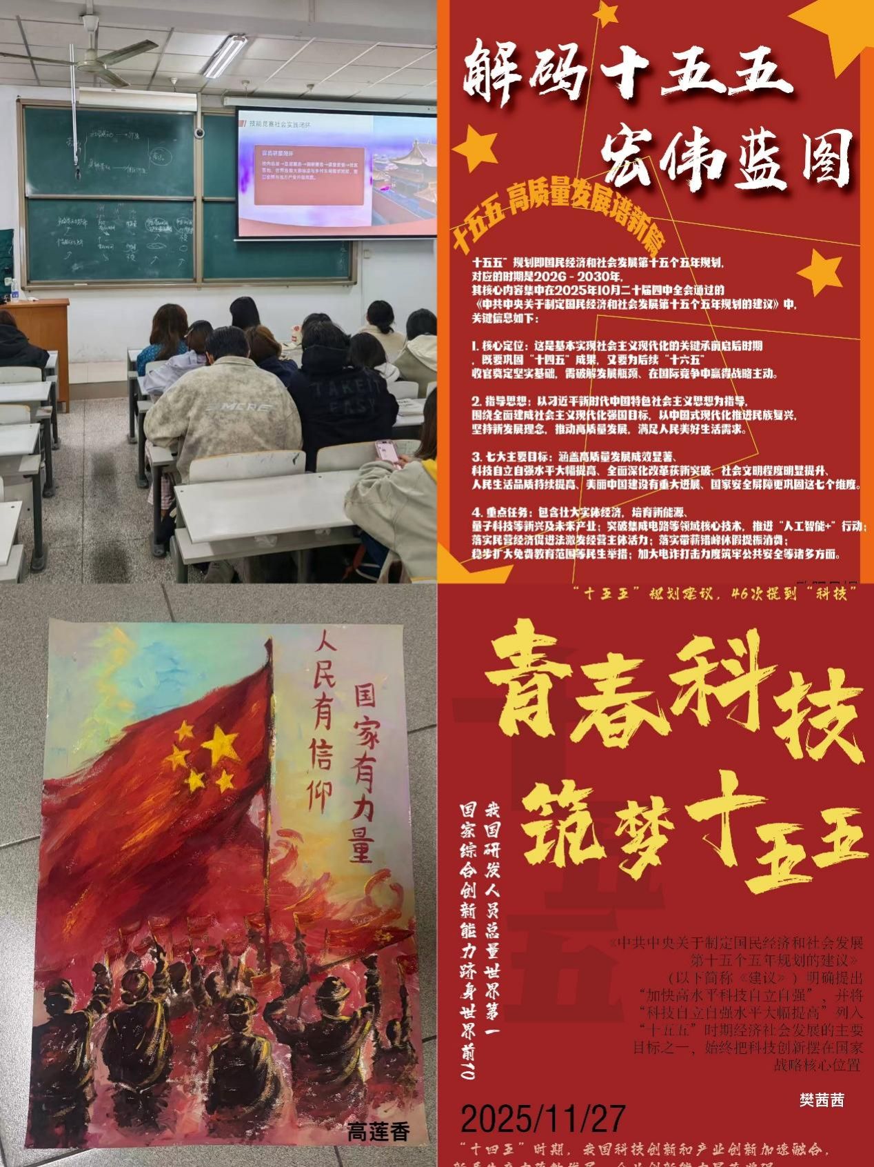 为深入学习贯彻党的二十届四中全会精神,引导团员青年准确把握“十五五”规划的核心内涵与实践要求,将个人理想融入国家发展大局,艺术学院2024级视觉设计本科1班团支部组织于2025年11月22日在郑州升达经贸管理学院综合大楼306开展“追逐十五五,妙笔绘宏图“主题团日活动,由团支书欧阳丹妮主持,全体团员青年齐聚一堂,以理论学习与艺术创作相结合的方式,解锁新时代青年的使命与担当。让青春力量与时代同频共振,让宏伟蓝图在笔尖落地生根。