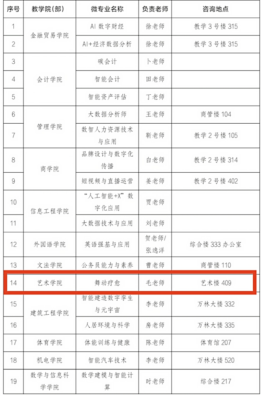 艺术学院首个微专业“舞动疗愈”申报成功获批,并将于11月25日开始招生。根据我校《郑州升达经贸管理学院微专业建设与管理办法(试行)》规定的微专业申报条件,艺术学院提前进行筹备并积极申报,申报经校外专家、学校教学工作委员会评审通过。