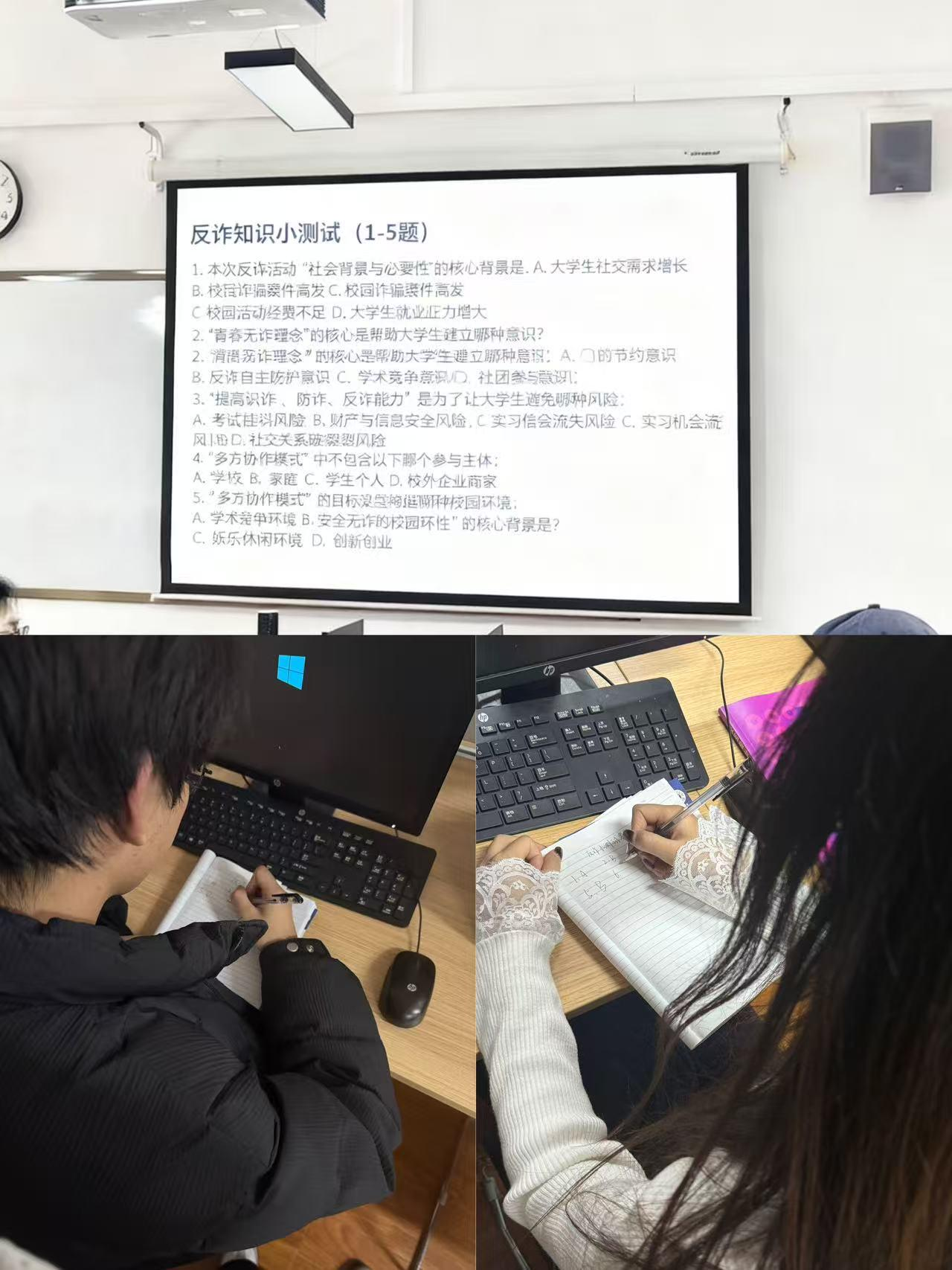 活动在热烈的反诈知识小测试互动中推向高潮,同学们踊跃抢答、快速应答,在趣味比拼中深化知识记忆,将反诈要点内化于心。总结环节,团支部发出“青春因安全而精彩,反诈因同心而有力”的倡议,号召全体同学以此次活动为契机,不仅做自身安全的“守护者”,更主动成为校园反诈的“宣传员”,通过分享所学、提醒身边人,让反诈意识辐射至班级、渗透至校园,以青春之力织密校园反诈“防护网”,共同守护清朗安全的成长环境。此次主题团日活动的成功举办,不仅提升了同学们的反诈素养与防护能力,更凝聚起青年群体同心反诈的青春力量,为建设平安校园注入了鲜活动能。