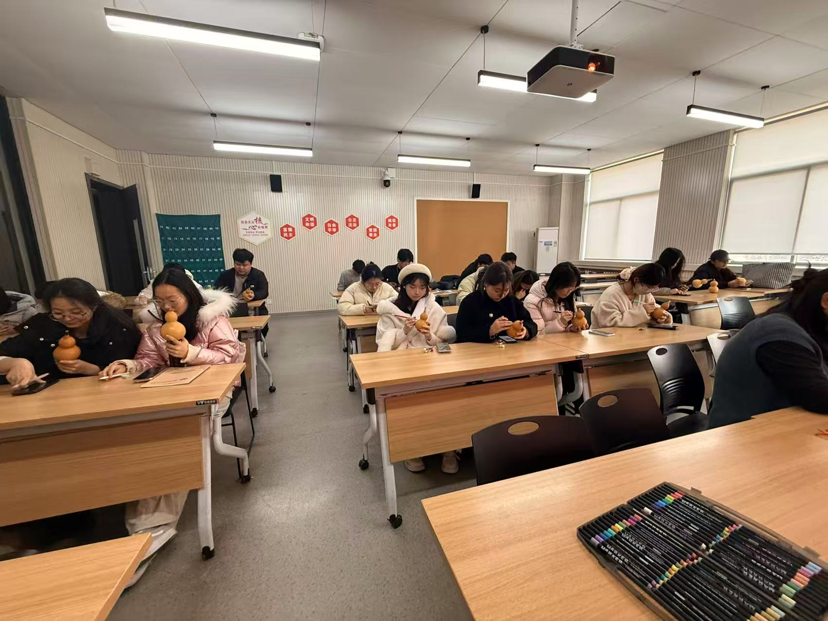 活动伊始,党支部组织委员王勇同志结合环境设计专业特性,阐释廉洁与艺术设计的深层关联,强调诚信执业、坚守底线的职业准则与党员担当。艺术学院党委纪委委员杨萌玮同志从纪律建设角度补充寄语,引导大家将廉洁意识融入专业实践。有美术基础的党员同志现场示范绘画技巧,为创作环节奠定基础。随后,大家运用丙烯马克笔在葫芦丝头上尽情创作,通过修竹、荷花、梅花等元素,结合书法、手绘等形式,将“廉”的内涵与环境设计的美学理念、秩序思维相融合,每一件作品都承载着对廉洁品格的理解与践行。