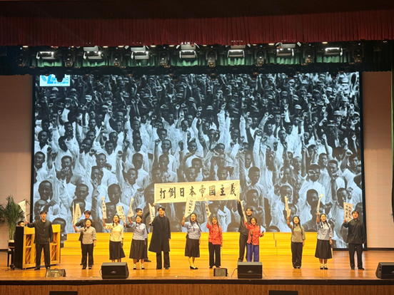由柴占红老师创作、编导的民歌短剧《日寇枪战卢沟桥》,音乐素材来自于河南孟县民歌,秦泽涵、张紫梦等同学凭借饱满的情绪、投入的表演、激奋的歌声瞬间将观众带回1937年的烽火岁月,让观众真切感受到中华民族在危亡之际不屈不挠的抗争精神,节目结束时台下掌声经久不息。