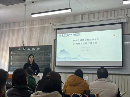 12月3日,声乐合唱教研室教研活动顺利举行,龚雪老师以“河南地方民歌授课心得”为主题分享教学经验。
