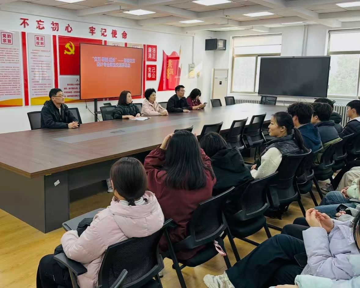 2025年12月11日下午,艺术学院智能交互设计专业在商馆楼218会议室举办“交互·联结·成长”主题师生茶话会。学院党委书记李赵法、院长吴柏林、副院长夏瑞芳及专业骨干教师出席,与2025级学生们展开深入交流。
