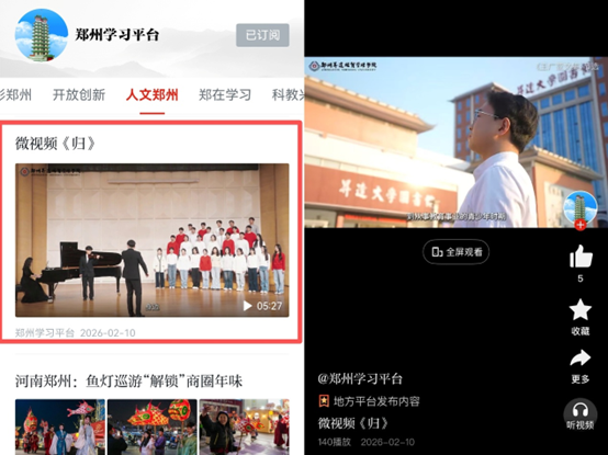 2026年2月10日,由郑州升达经贸管理学院艺术学院师生共同创作完成的短视频《归》,相继被学习强国、网易新闻等平台转载,引发广泛关注。