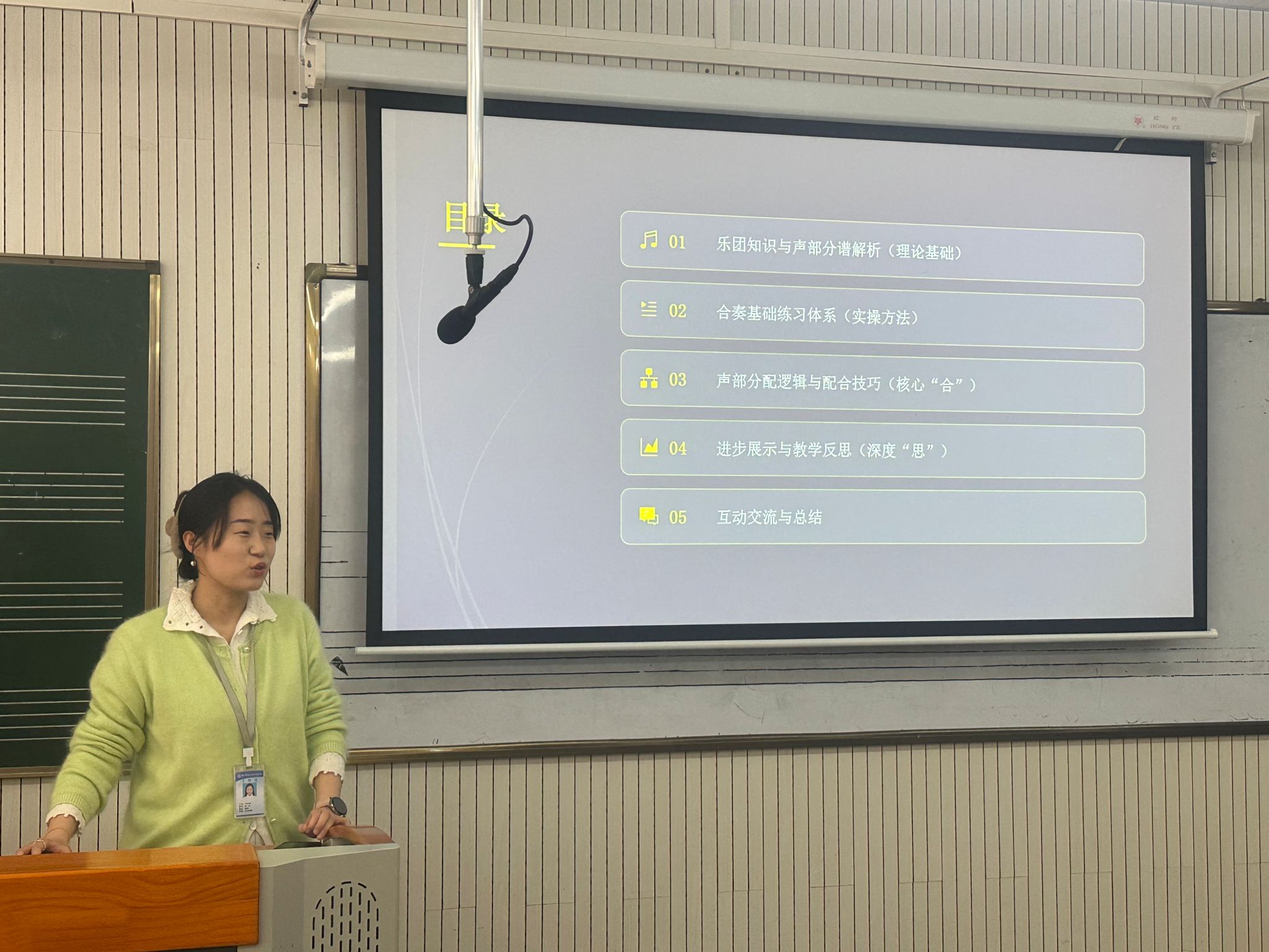 张一可老师以音乐教育《乐团排练与实践II(民乐)》课程为例进行专题研讨,将艺术实践与教学研讨深度融合,助力音乐美育教学提质,并围绕学生乐团排练中的协作培养、音乐思辨能力提升等问题交流心得,剖析教学难点,梳理排练优化思路。既锤炼了学生的演奏技能与团队协作意识,也为音乐教育教学积累了实践经验,推动美育教育与艺术实践同向发展。