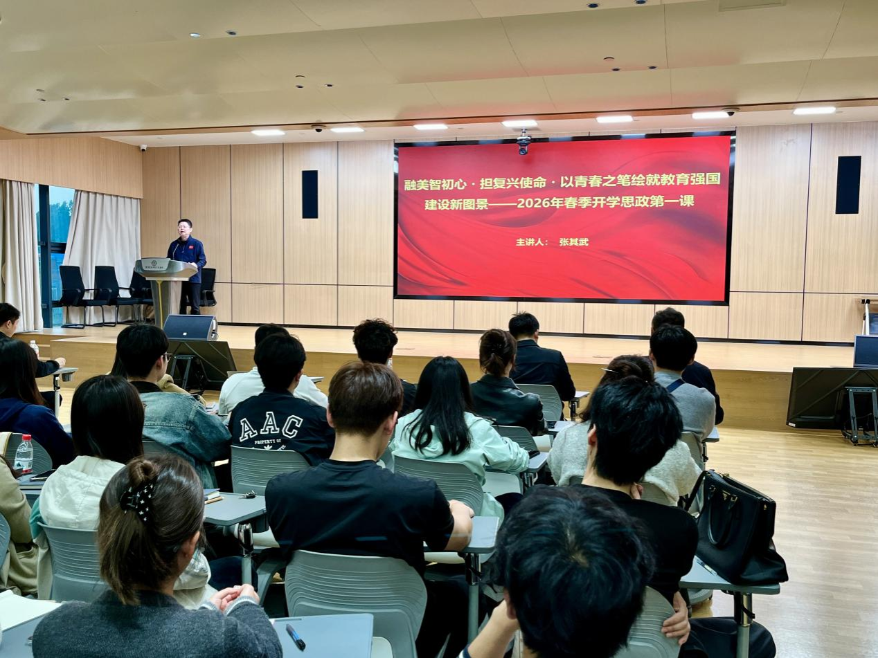 为深入学习贯彻习近平新时代中国特色社会主义思想,全面落实立德树人根本任务,引导青年学子坚定理想信念、勇担时代使命,4月9日晚,校党委委员、副校长张其武以《融美智初心·担复兴使命·用青春之笔描绘教育强国建设新蓝图》为题,在新图书馆第二报告厅为艺术学院和数学与信息科学学院师生代表讲授2026年春季学期开学思政第一课。