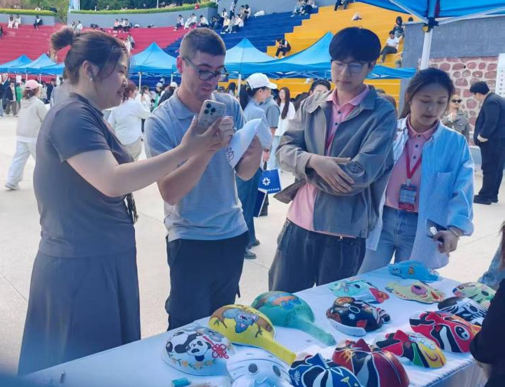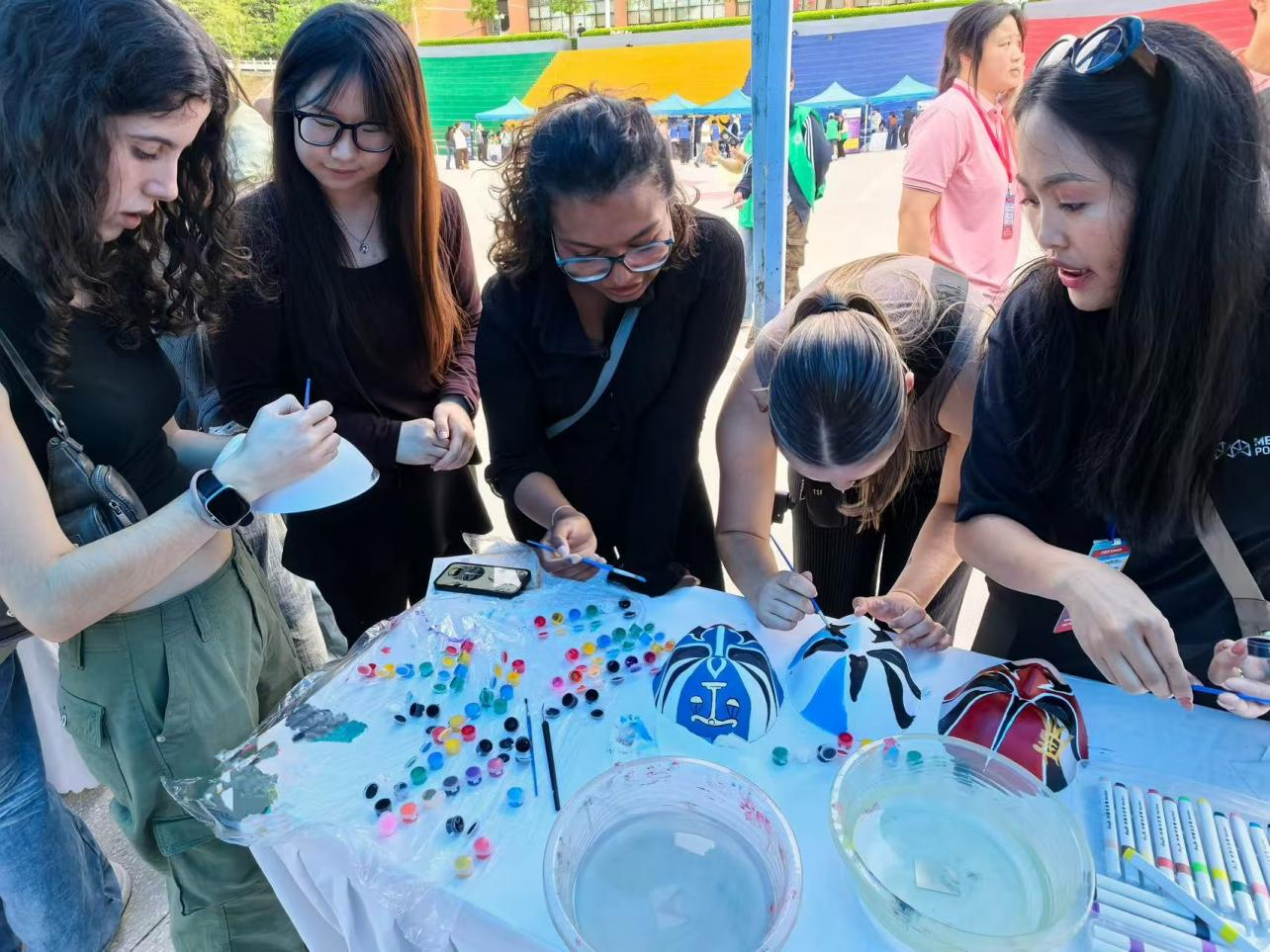 活动现场氛围热烈,中外师生齐聚一堂。艺术学院音乐表演专业与舞蹈表演专业学生第一党支部在党支部书记吕文娟同志的带领下,充分发挥艺术专业特色,精心设置豫剧、京剧脸谱彩绘、葫芦莲花作画、创意丙烯手绘等特色体验项目,将中华戏曲非遗、古典文学、传统文化融入趣味创作之中。