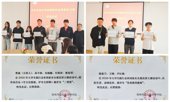 近日,在郑州升达经贸管理学院2026年大学生践行总体国家安全观宣讲大赛中,艺术学院传媒社团组建的“艺心卫安”团队凭借作品《守文化根脉,护安全屏障——新时代大学生与文化安全同行》荣获二等奖,指导教师陈家宁、王晴、尹红艳获指导教师奖。