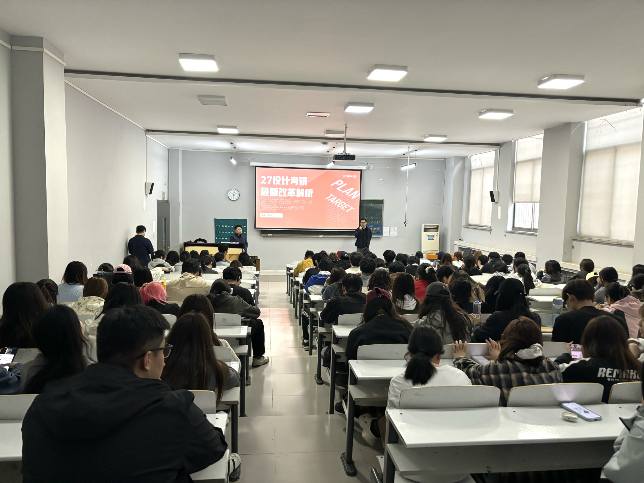 宣讲人结合乡村振兴、生态文明建设等战略背景,指出环境设计行业对高素质、创新型专业人才的持续需求,还具体分析了近年来设计类研究生招生的政策变化,鼓励同学们科学规划,将个人发展与时代需求相结合,为未来升学与就业做好充分准备。