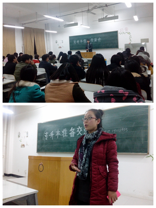 11月26日晚,艺术楼304教室气氛热烈,座无虚席,2014级艺术设计专升本班推出的四位优秀学生代表分别为同学们做了报告。高东栋同学围绕着“为什么要专升本”讲了本科学历的重要性。张春蕾同学侧重怎么复习及学习时间安排,翟露燕同学就报考流程及填报志愿做了讲解,最后范圳斐同学就专升本机会与在校表现的关系进行了介绍。随后,同学们之间又进行了提问交流。